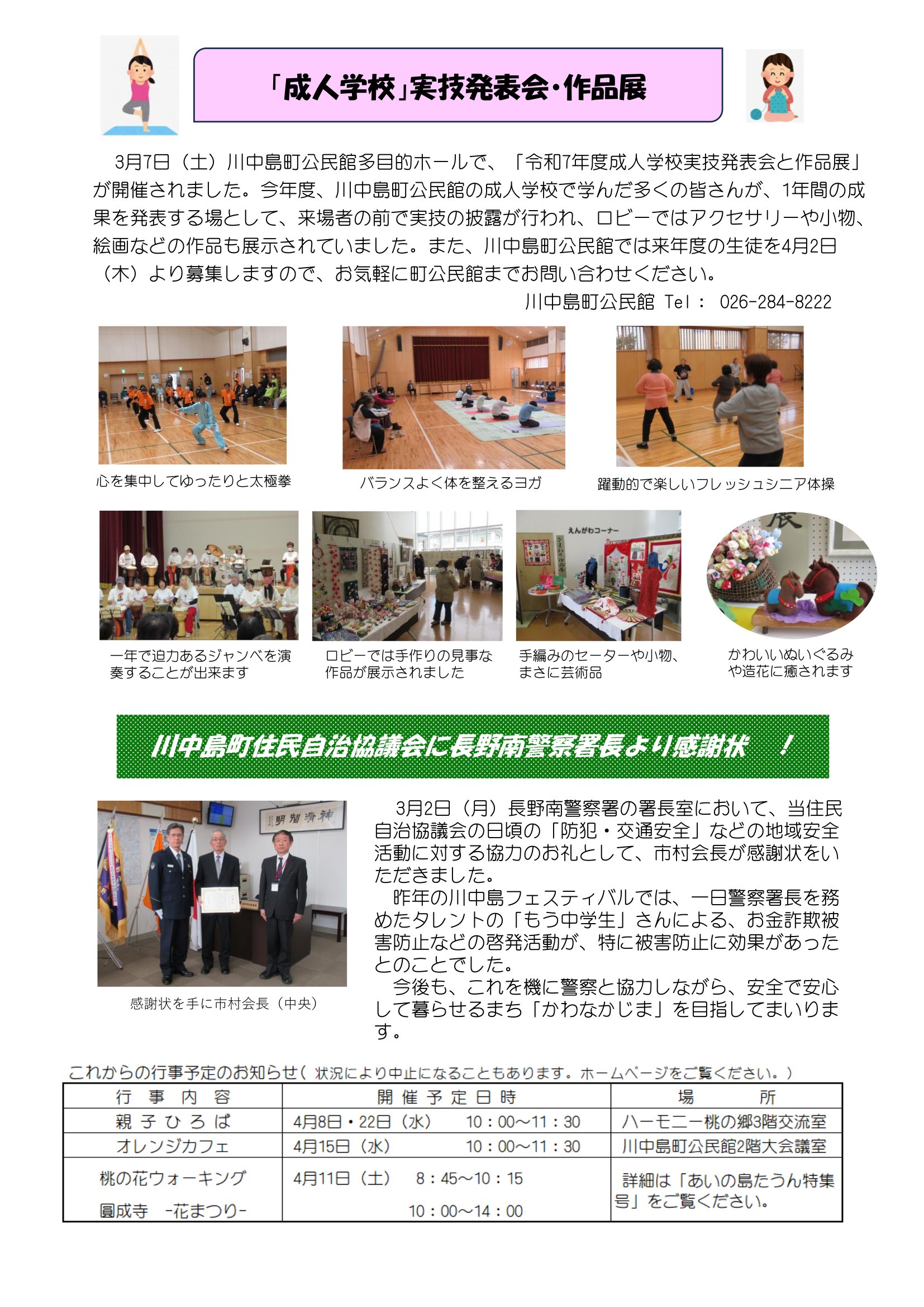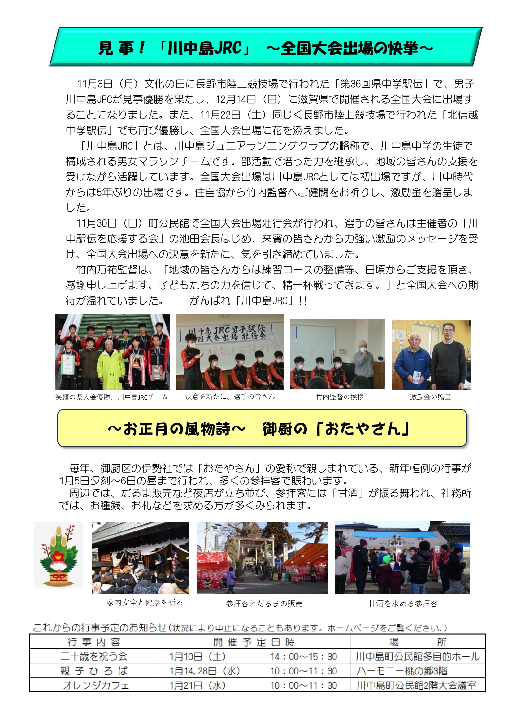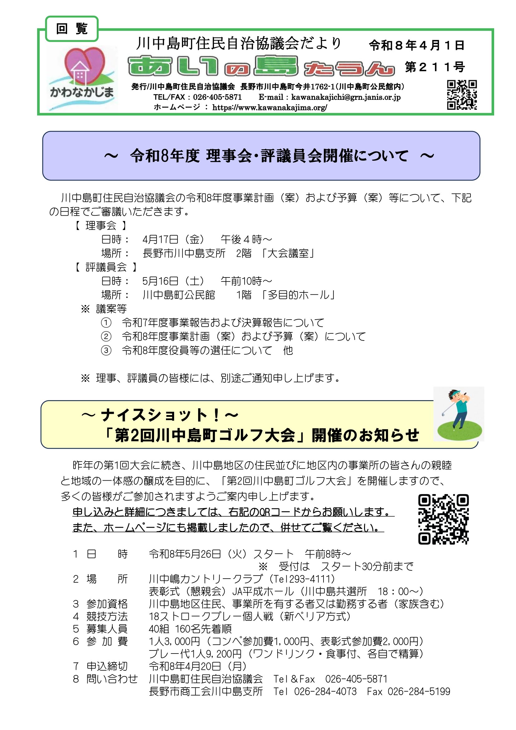 川中島町住民自治協議会 長野県長野市川中島町今井1762-1 TEL 026-405-5871 kawanakajichi@grn.janis.or.jp |